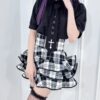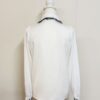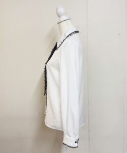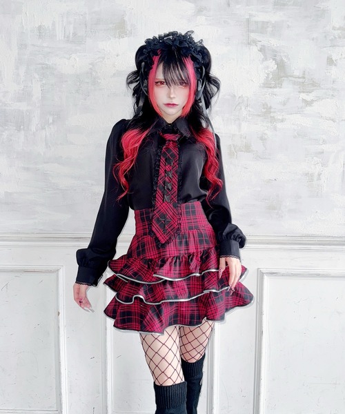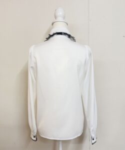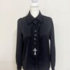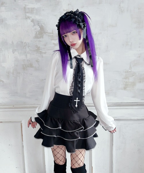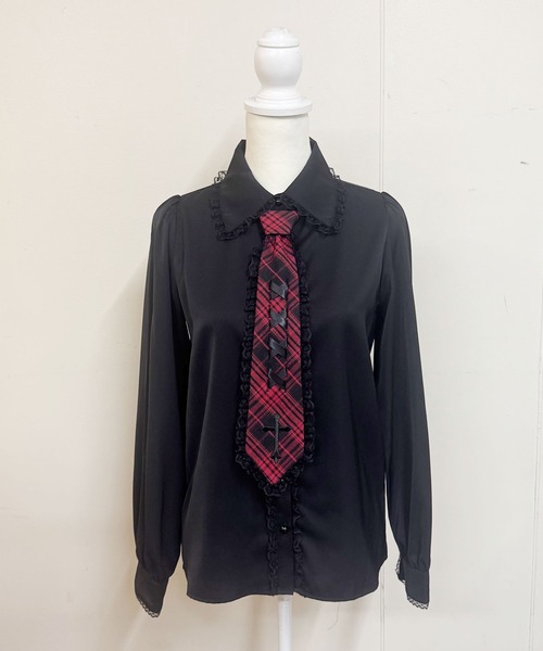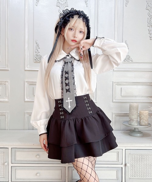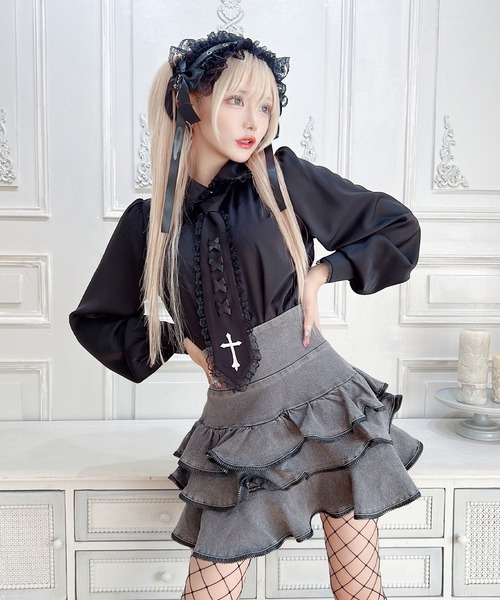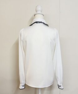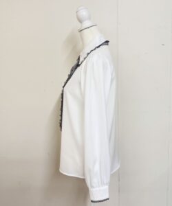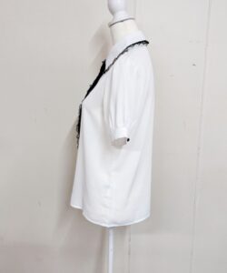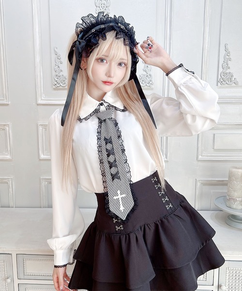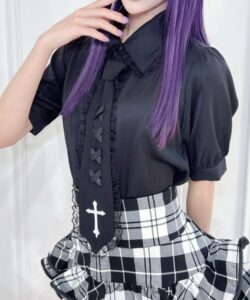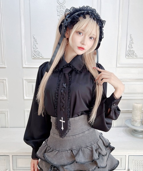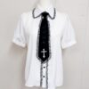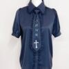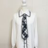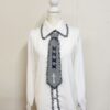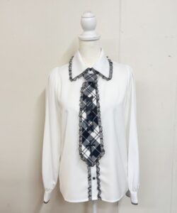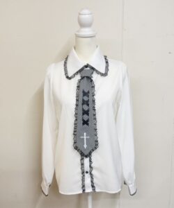 An adorable blouse featuring a tie with eye-catching cross embroidery that stands out beautifully.