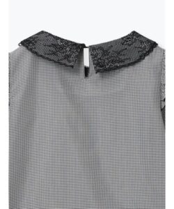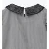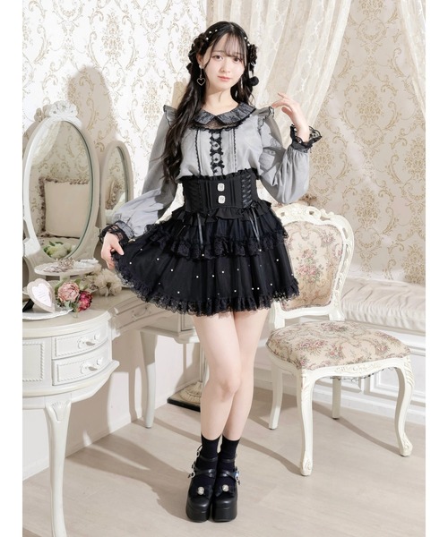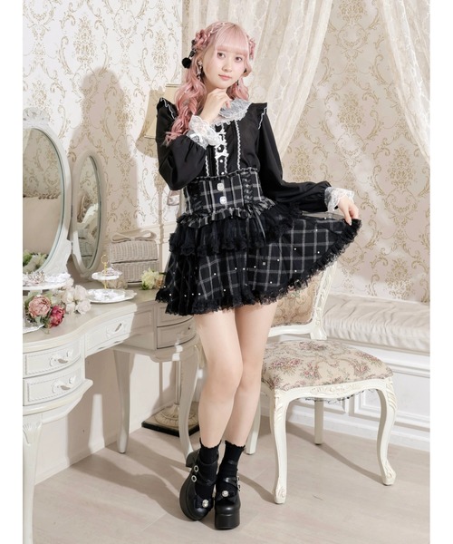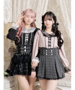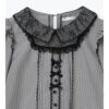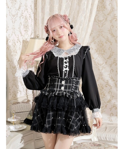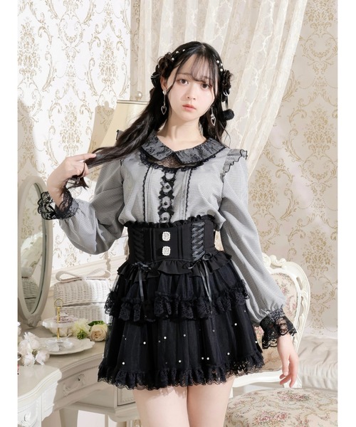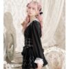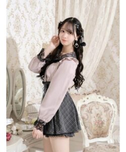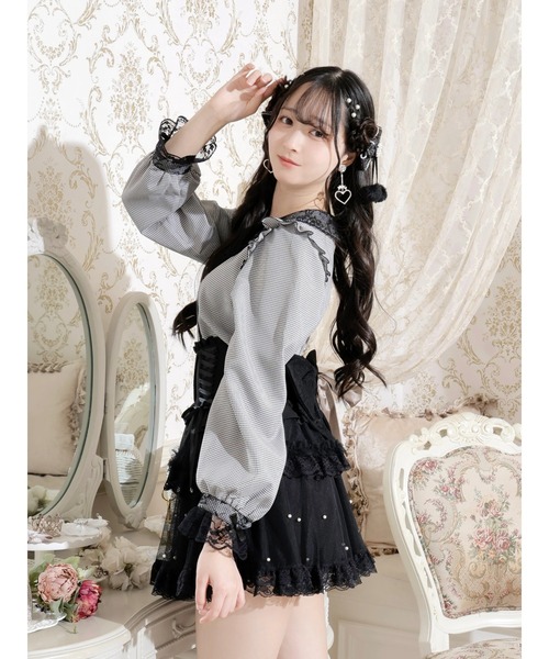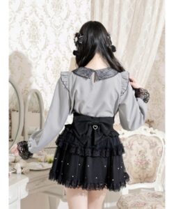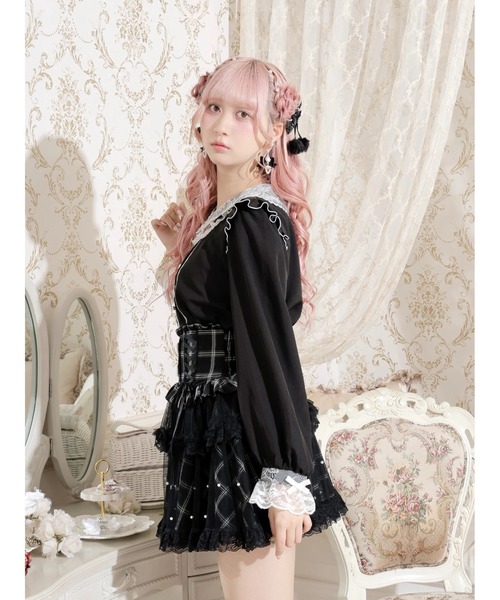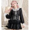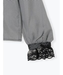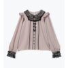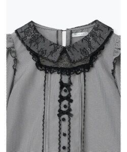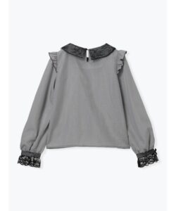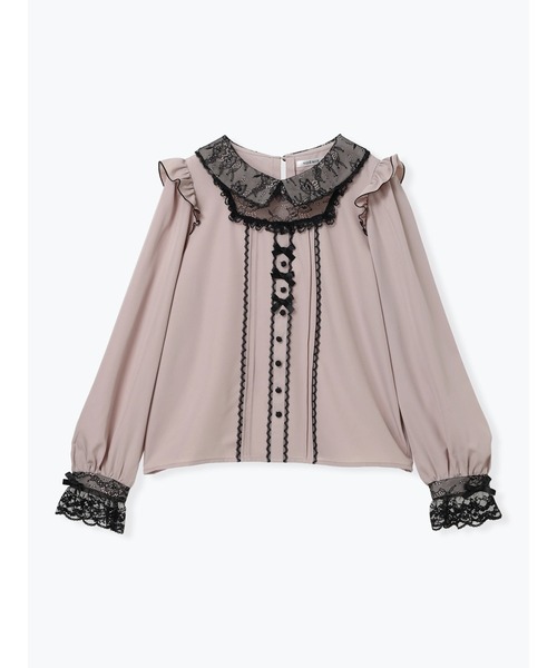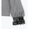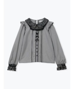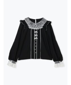 Lace is applied to the collar and cuffs, enhancing the look with an elegant and glamorous touch.