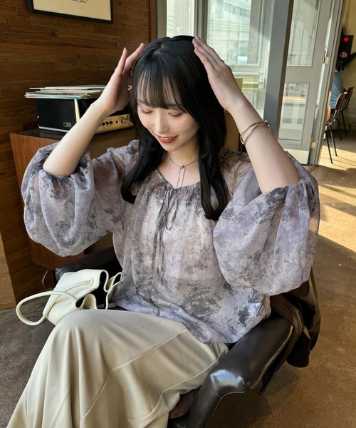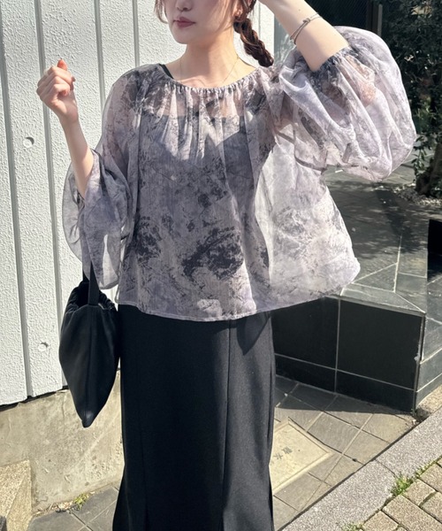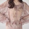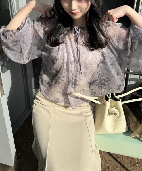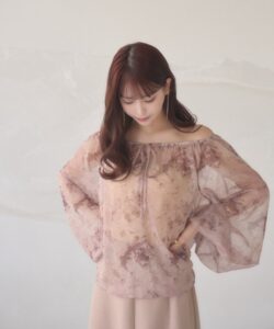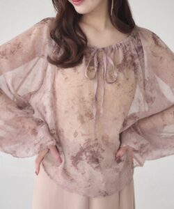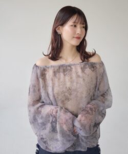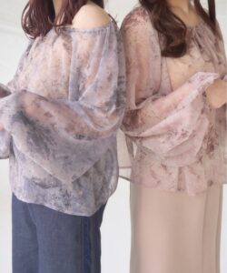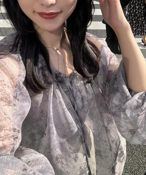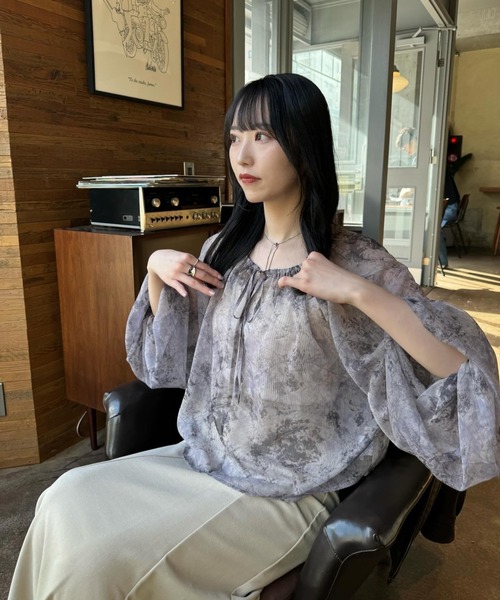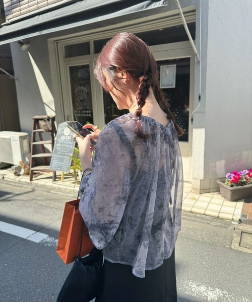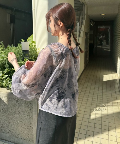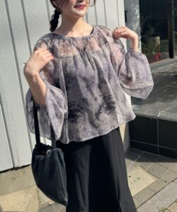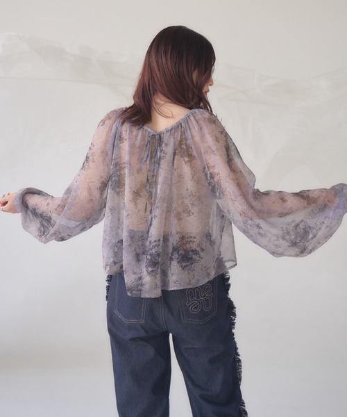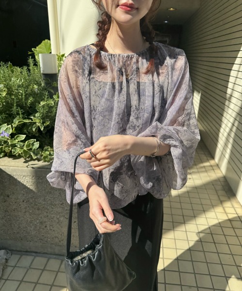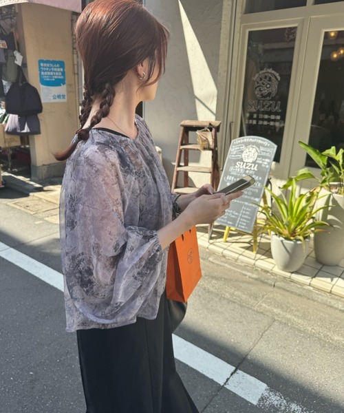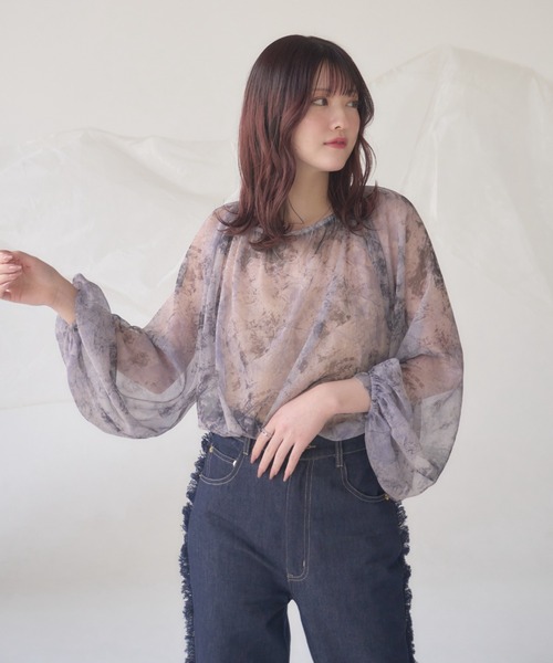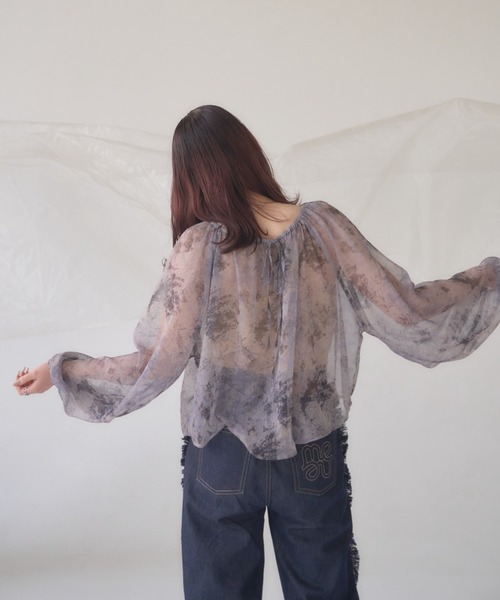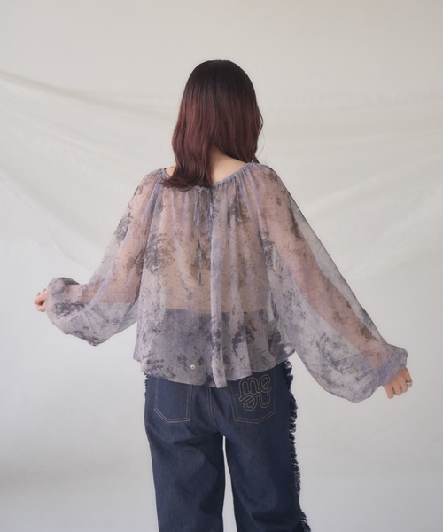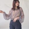 A sheer blouse featuring an original printed pattern created with great attention to detail, showcasing subtle nuance colors that cannot be found elsewhere.