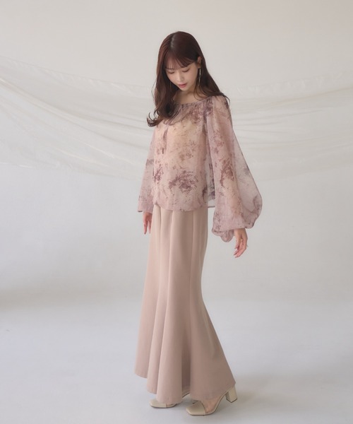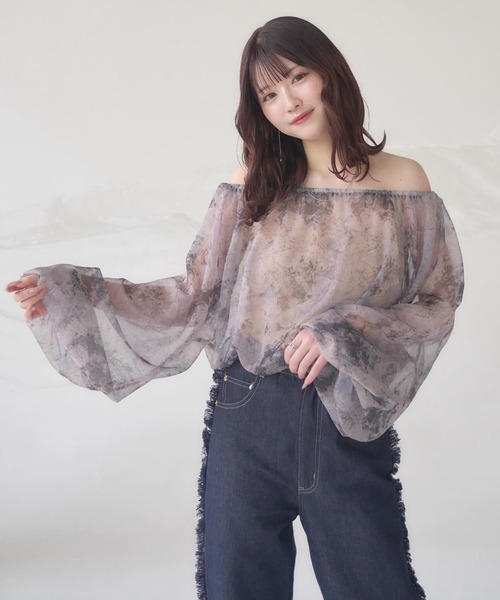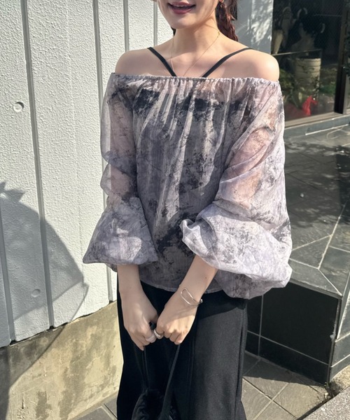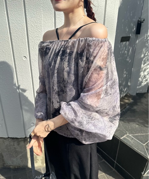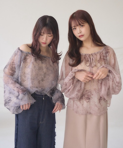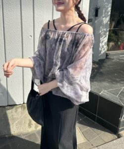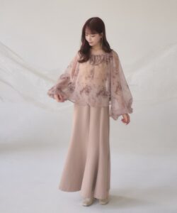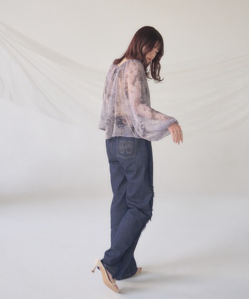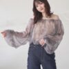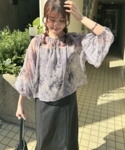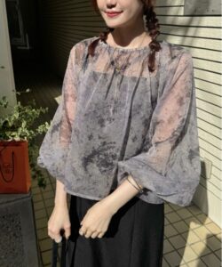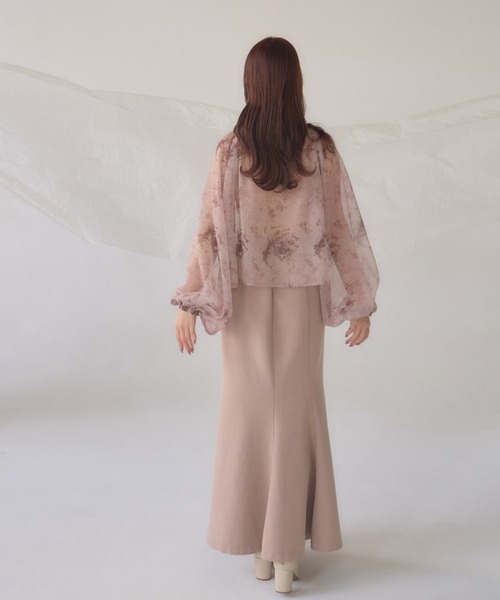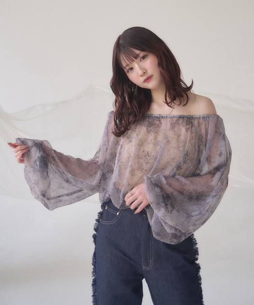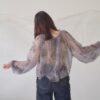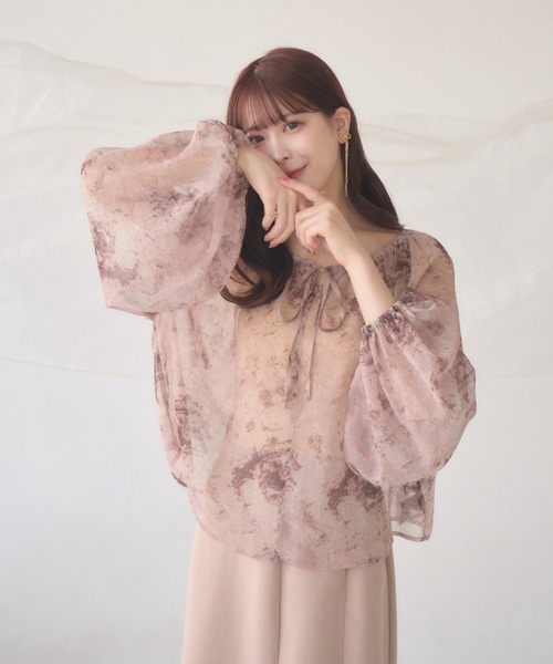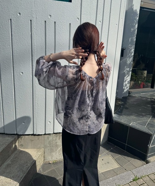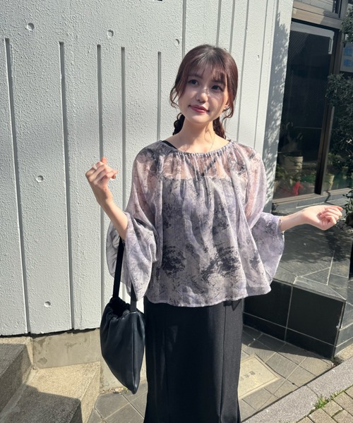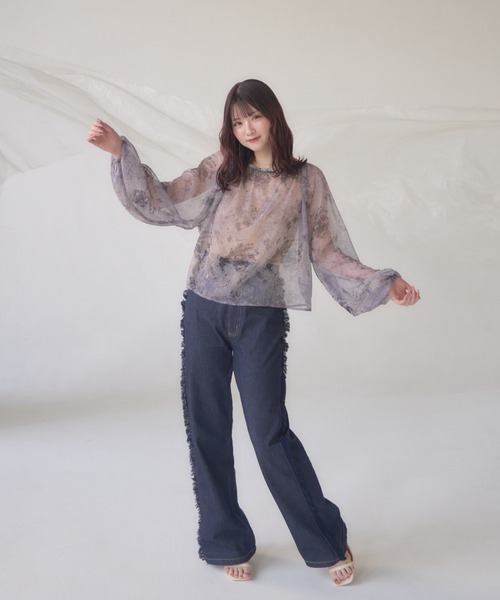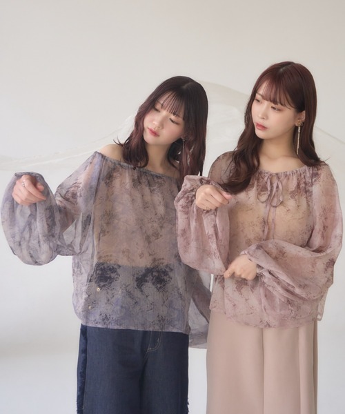 A sheer blouse featuring an original printed pattern created with great attention to detail, showcasing subtle nuance colors that cannot be found elsewhere.