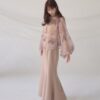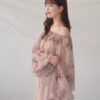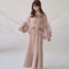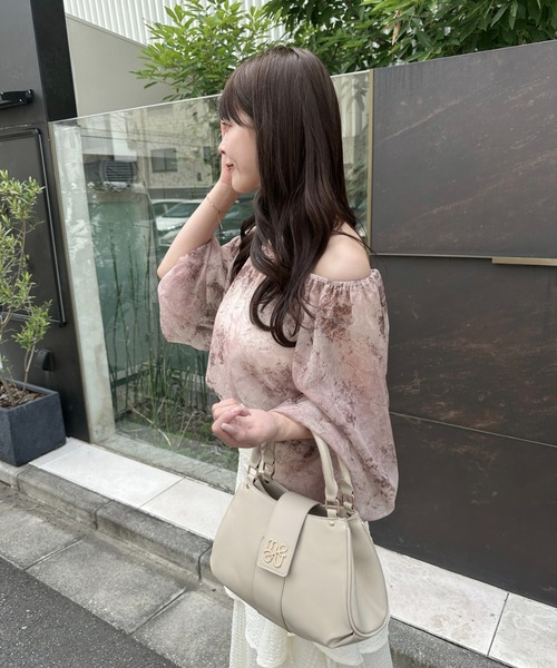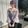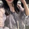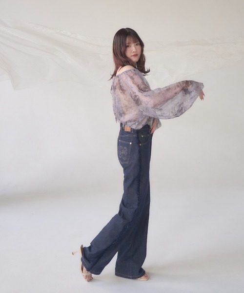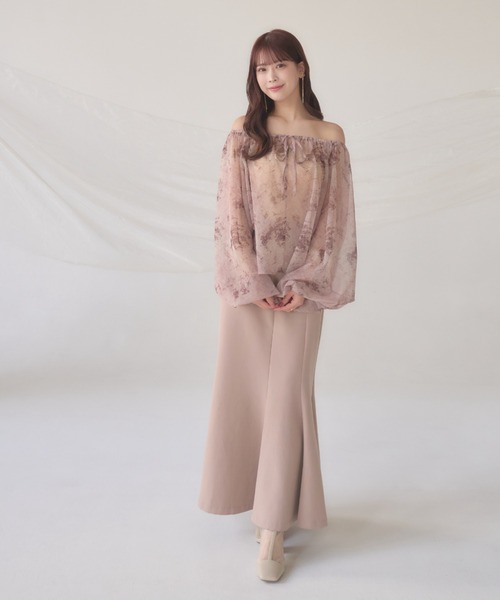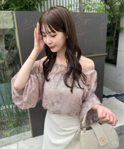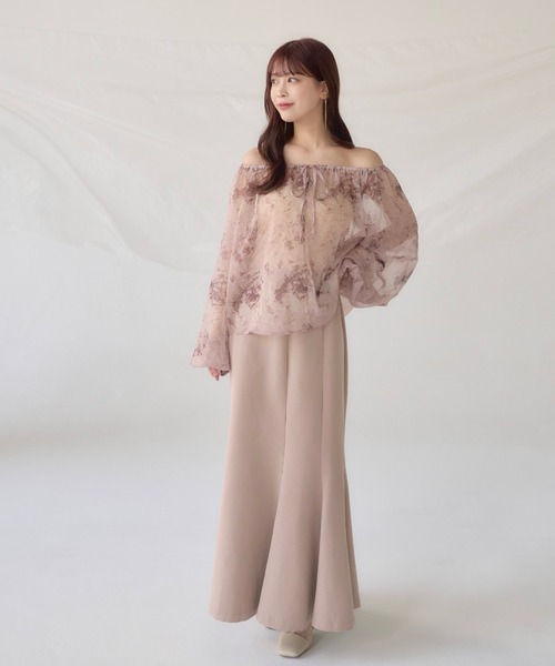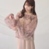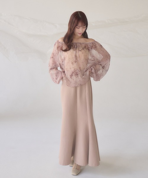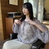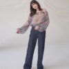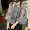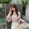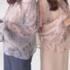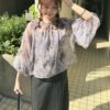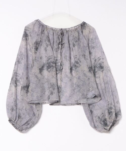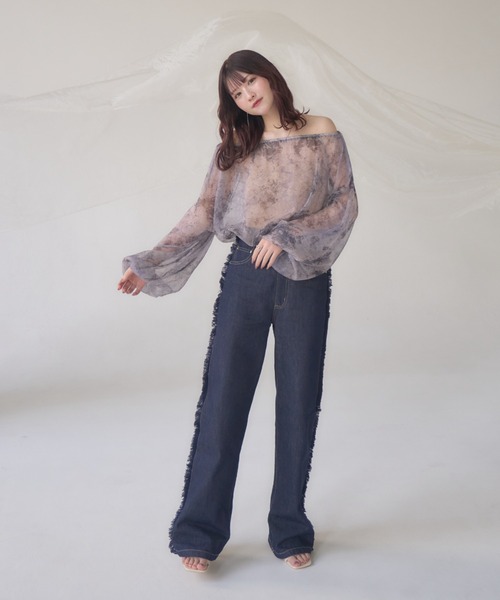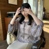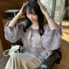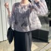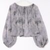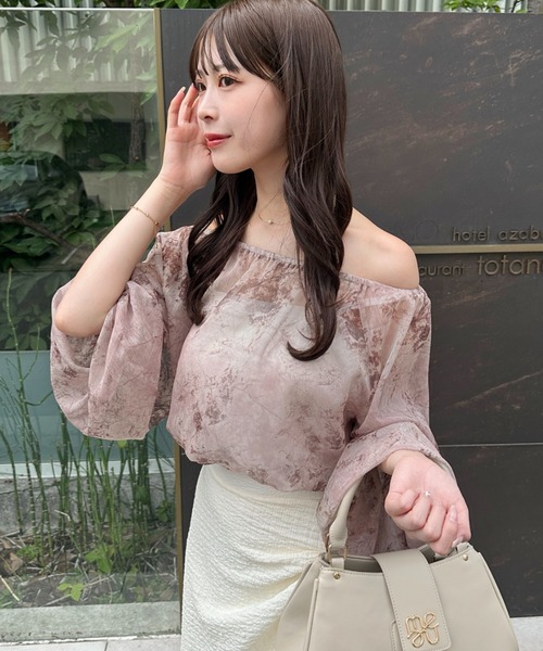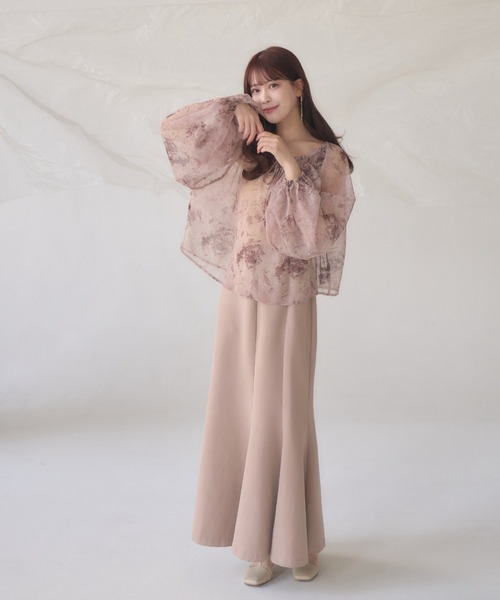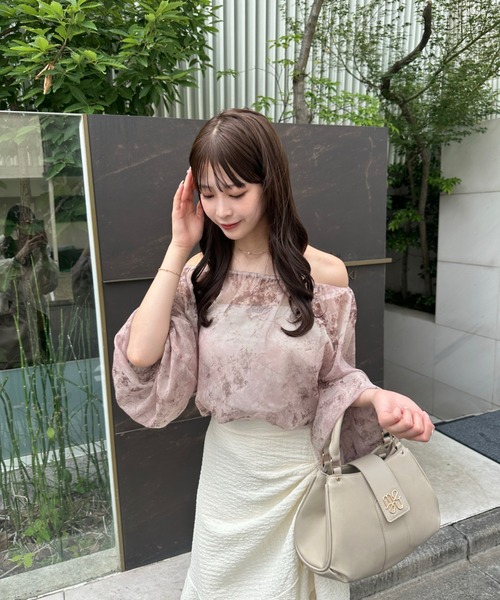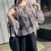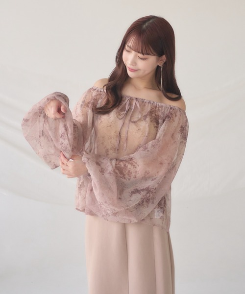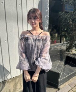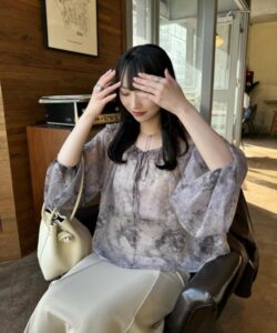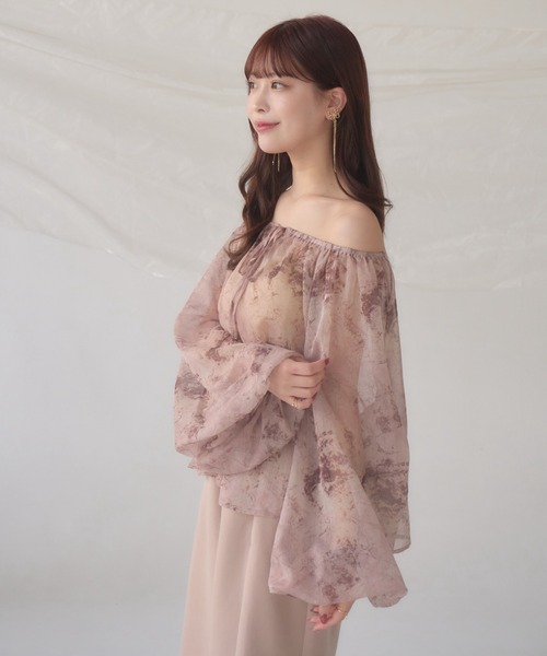 A sheer blouse featuring an original printed pattern created with great attention to detail, showcasing subtle nuance colors that cannot be found elsewhere.